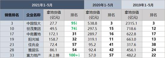 没错,这家企业是恒大。其2019年、2020年拿地金额始终保持前三,但其今年前五月仅支出27.7亿元用于拿地。
