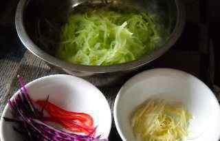7 紫甘蓝、红椒、姜、蒜切细丝。