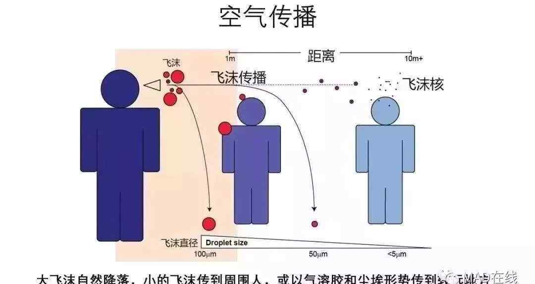 病毒携带者在呼吸、咳嗽、打喷嚏时,会从人的口、鼻中释放出飞沫(气溶胶飞沫),其中大部分大到可以沉降在地面上,而小飞沫则迅速干燥收缩形成飞沫核,主要由直径较小的生物颗粒组成,可以长时间悬浮在空空气中[4]