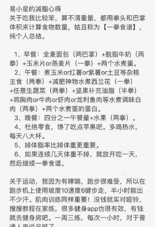 名叫野兽易小星的她在拍摄前瘦了很多。她4个月瘦了35斤,完全像变了一个人。他的也很像谭维维的,基本上是水果蔬菜和粗粮,还附上了自己的健身秘籍