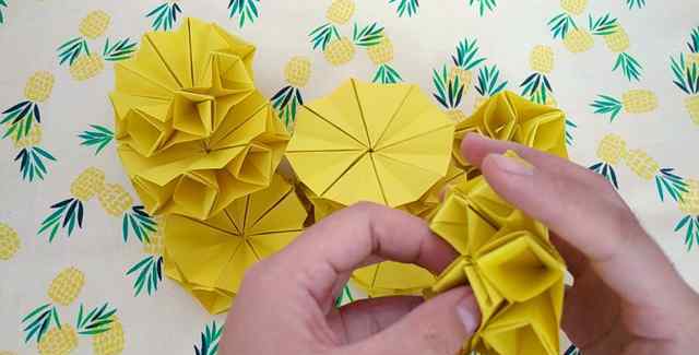 然后把菠萝的六个角粘在底层,把八个角压在六个角的上面