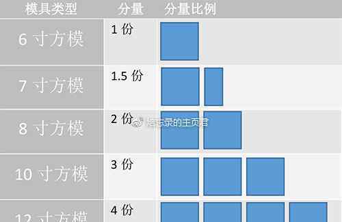如果我们按蛋糕原料的重量做一个6寸的圆模,8寸的圆模大概需要两倍的重量。正方形模块之间使用相同的比例转换。
