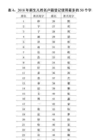 2018年公安机关登记的新生儿姓名中,使用频率最高的词是:子、于、子、韩、泽、于、贾、郝、辛、宣。