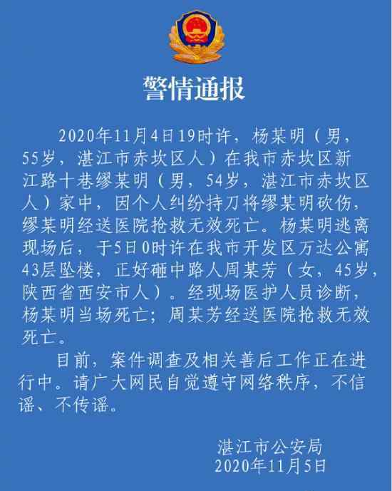 报道称,2020年11月4日19时许,杨谋明(男,55岁,湛江市赤坎区人)在湛江市赤坎区新疆路10弄苗谋明家中。苗谋明因个人纠纷被人用刀砍伤,送医院抢救无效死亡。杨谋明逃离现场后,于5日零时许从湛江开发区万达公寓43楼坠楼,正好撞到周默芳(女,45岁,陕西省Xi市人)。经现场医护人员诊断,杨谋明当场死亡;周某某送医院抢救无效死亡。目前,案件调查及相关善后工作正在进行中。