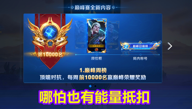 但是这一种方法在巅峰赛里却行不通,虽然现在的巅峰赛也有能量机制,每一把结束后都会有能量加成,在输了以后,能量会通过3:1的机制来抵消扣除的巅峰积分,从而来达到低胜率高积分的情况,和勇者积分其实就是叫法的不同而已。