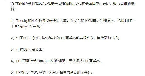 LPL夏季赛将至,各个战队都摩拳擦掌准备冲击总冠军,很多战队都买入了强力的选手,其中浪花最大的当属TES,签下晴天要挑战RNG的霸主地位,但与此同时,有的选手因为种种原因无法参加比赛,只能选择暂时离开赛场。
