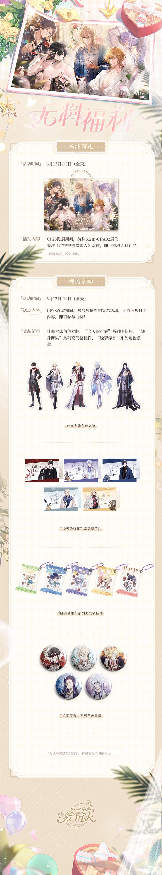 6月12日-6月20日参与《时空中的绘旅人》微博话题活动,分享cp28漫展中与《时空中的绘旅人》有关的内容,将有机会获得游戏周边礼包。详情请关注@时空中的绘旅人官方微博账号。