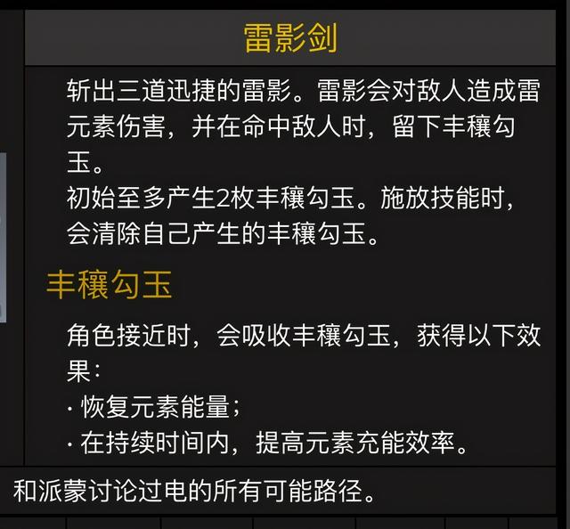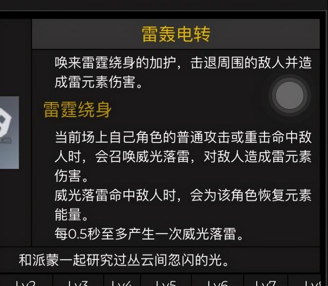 雷霆饶身效果:当前场上角色普攻或者重击命中敌人时,会召唤落雷攻击,对敌人造成雷元素伤害;落雷命中敌人时,会为该角色恢复元素能量,每0.5秒最多产生一次落雷。