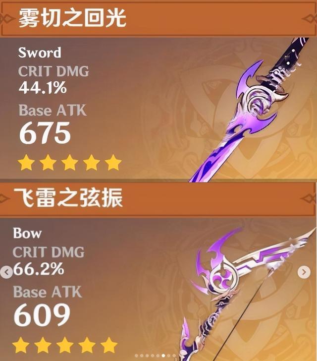 目前稻妻曝光的新武器有四把,两把五星两把四星,两把五星武器分别是雾切之回光(单手剑)和飞雷之弦振(弓箭),两把武器的造型都相当帅气,可以说是非常值得期待了,并且有内鬼表示后续武器池将迎来改版,或将改变双UP无保底的机制,让更多玩家可以获得自己想要的武器。