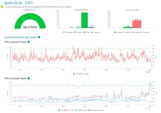 通过用开始和结束标记定义游戏的区域,性能顾问可以为每个区域分别报告分析。在本例中,我们可以看到“Battle”区域的性能信息: