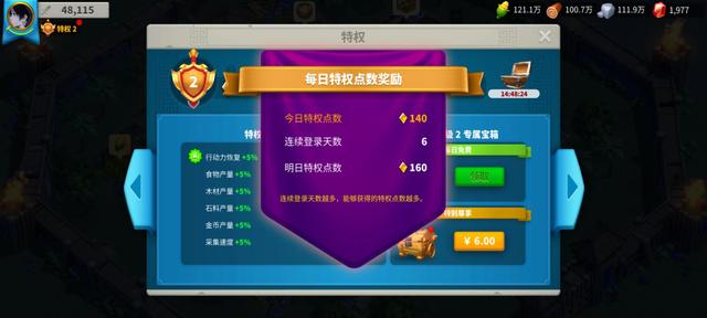 在个人特权中每天都会有相应的奖励领取,一个是开启宝箱,其中能过去一定量的物资;另外就是可以领取专属宝箱,这个特权的升级对于城池内整体都有一定的效益。