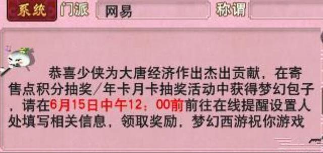 梦幻中玩家出售点卡换取梦幻币的时候是会获得三界功绩作为奖励的,而且出售点卡时也会获得一定数量的售卡积分,这些售卡积分可以兑换奖励,也可以用来抽奖,用售卡积分抽奖就可能会获得上面的这种实物奖励,只不过大家获得实物奖励之后真的不要太过兴奋,因为在梦幻中获得的实物奖励送到自己手中还有一个非常长的时间,小编之前获得了一个实物奖励,等了半年才送到呢,所以上面这位玩家获得的梦幻包子有要等到过年。