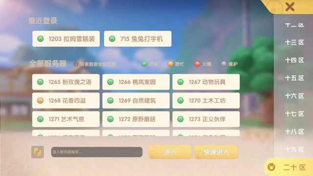 之后是选择服务器,不得不说……这游戏服务器是真的多,一共有20个区,1200+个服务器,服务器的名字还都挺逗的,不知道背后有没有关于摩尔庄园的梗,这个没深入了解。