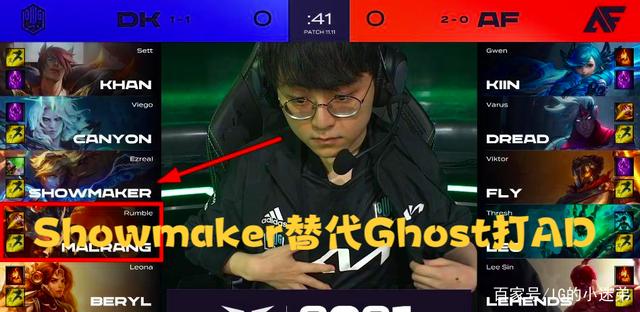 DK这边安排的是Malrang打打野位置,Canyon打中单位置,看到这里就有玩家要问了:Showmaker呢?因为Ghost被拿下,Showmaker自然是去打AD位了。