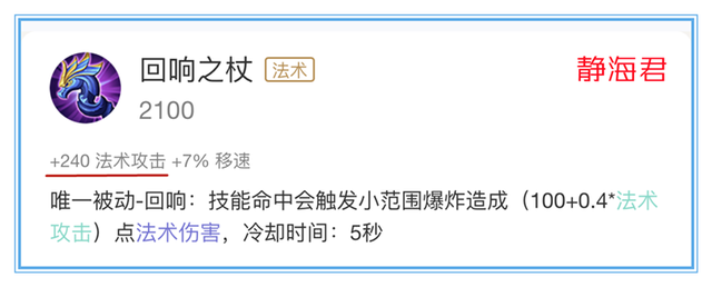 当然了,肯定有人会说,你这么比不对,在计算博学者之怒的属性时,一定要算上其它的装备。那好,根据正常情况,法师们先出的第一件输出装都是带有移速加成和范围伤害的「回响之杖」,那我们再用它来计算一下属性。