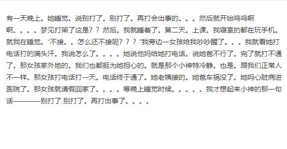 先是同寝的一个女孩打电话给家里,本来她妈妈告诉她爸爸出车祸,再后来她妈妈电话就打不通了,结果就是她妈妈也出事了。楼主这时候就想起大神说过的梦话:别打了别打了,再打出事了。