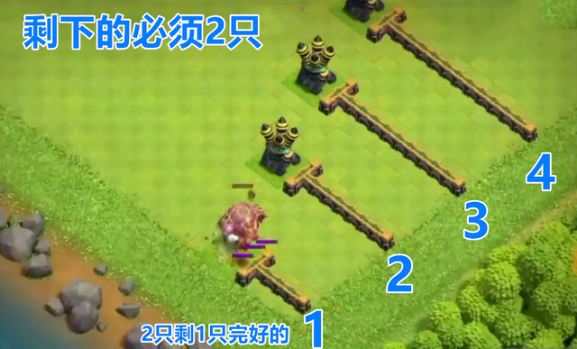这是国外一位狗球大神演示“火箭气球兵”伤害的截图,我们在图中可以清楚的看到,目标在四块城墙以内,一个满级的火箭气球兵能够和一个满级的防空导弹同归于尽,剩下的距离必须用两只满级的火箭气球兵才能摧毁防空导弹,小白展示这个截图也没有别的意思,只是告诉小伙伴如果想摧毁距离在“4格”以外的防空导弹,必须同时释放两只火箭气球兵。