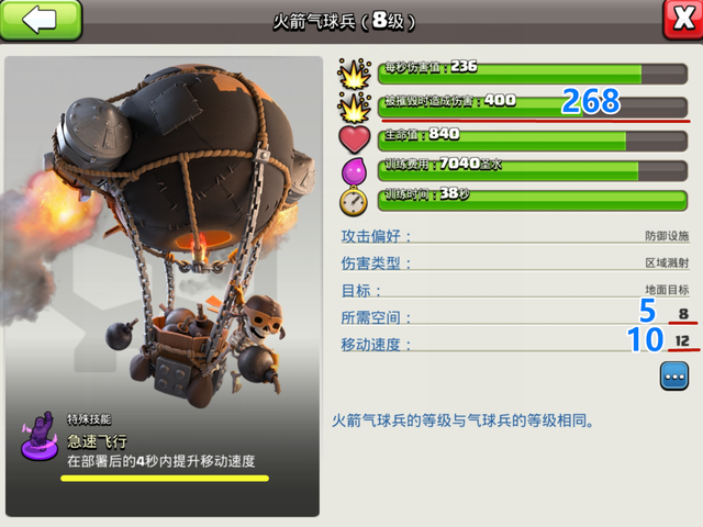首先我们拿新兵种“火箭气球兵”和“普通气球兵”来一个横向的对比,火箭气球兵与普通的气球兵,伤害、生命值都是一模一样,不同的是“火箭气球兵”被摧毁后的伤害比普通的气球兵高出很多,但是这些数据是用“空间单位”换来的。当然了火箭气球兵的那个特殊技能(4秒的加速)也要计算在里面。