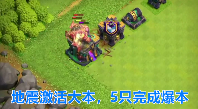 进攻14本的时候,小伙伴们大多都会选择飞艇爆本,如果飞艇里面装得是“火箭气球兵”的话,数量一定不要少于5只,当然这个实验是用地震激活14本以后做出来的,5只火箭气球兵完成了爆本的任务以后,只存活了1只火箭气球兵,并且血量只剩下了一点点。