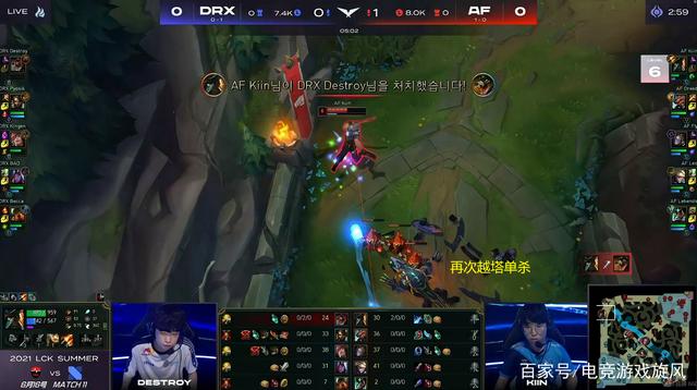 2021LCK夏季赛常规赛,新赛季中DRX迎来了主教练cvMax的回归,首秀战就像观众展示了熟悉的麦之BP,经历了失利之后,第二场对战AF的BO3,麦哥又开始整活,首发名单上让Kingen来打中单,新人上单Destroy来应对强敌Kiin!首局比赛DRX拿到上野动物园组合,鳄鱼豹女就是想围着上路来打,但同样的放出了版本强势的EZ卡尔玛给到AF,Kiin面对这样的局面选择了用船长来应对。