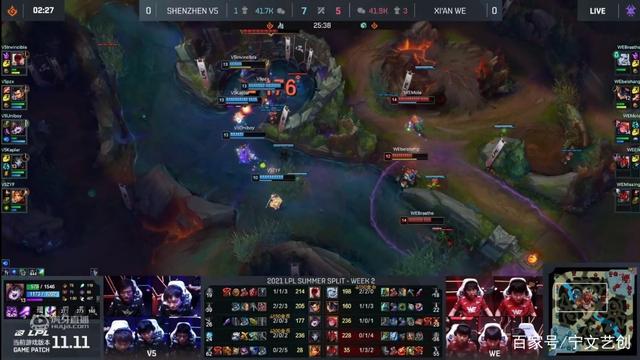 不过两支队伍的实力还是有差距的,V5战队即使前期取得了优势,也不知道怎么把握,反观WE这边则是靠着自己的poke阵容稳住了局面,眼看比赛越来越胶着,V5战队也是决定放手一搏,趁着优势拿大龙,并且直接击杀了WE战队两人。