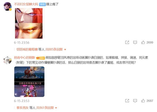 简单回顾一下经过:大概一周前,阴阳师某超话的主持人发声,称王者荣耀2019年上线的“伽罗”皮肤在动作上抄袭了决战平安京的“白狼”;几天后,决战平安京的官博转发并艾特了王者荣耀官博,还顺手“感谢帮忙传播”;5个多小时候,王者荣耀官博正面回应,详细解释了伽罗箭羽风息皮肤设计的思路,简单来说就是“老子是自己原创的,你别逼逼”。