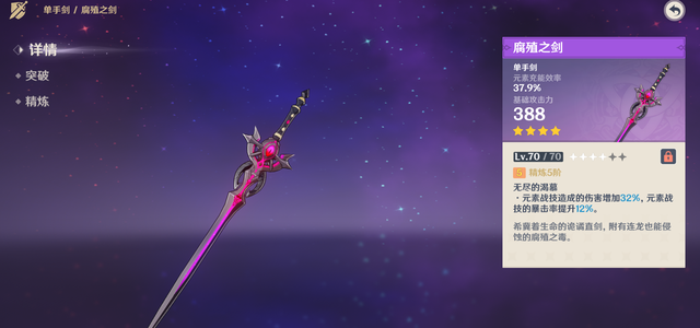 首先就是那个版本的主角阿贝多,就很适用这件武器,增加元素战技的伤害,以及元素战技的暴击几率。是非常好用的一件武器,但是大多数的玩家,还是会选择精5的黎明神剑,作为阿贝多的武器,毕竟练起来简单。但腐蚀之剑适合很多的副C,用来打脱手是一个很不错的选择。