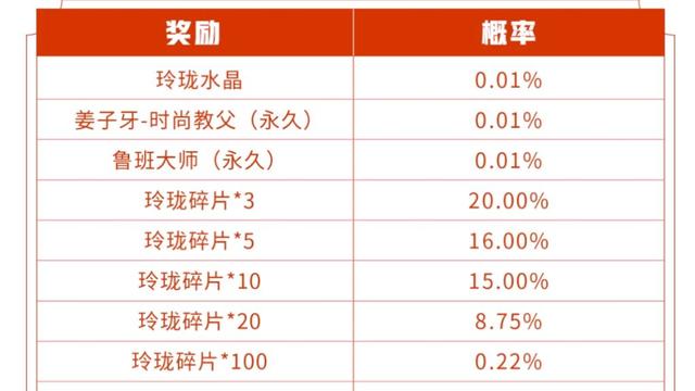 而跟随新赛季更新上线的玲珑商店第一期的内容已经得到了确认:除了玲珑水晶和玲珑碎片外,皮肤奖励就是姜子牙——时尚教父,英雄奖励是鲁班大师,还有其他的英雄体验卡等这里就不再提及了。只不过高级点的奖励中奖概率也是比较低的,其中玲珑水晶、皮肤、英雄无疑是中奖概率更低的一批。
