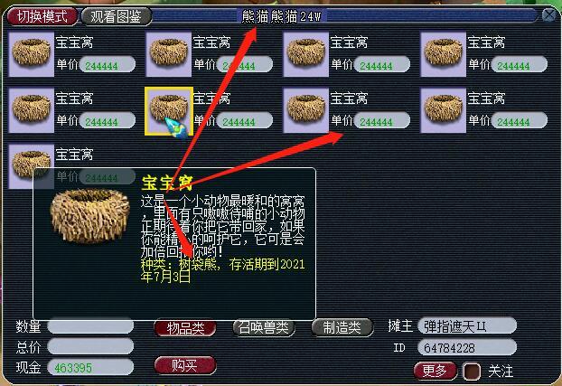 那些玩牧场的玩家有些人可以保证自己的宝宝窝自给自足,但是梦幻中很多的玩家都是需要购买的,这里面熊猫就属于高价值的宝宝窝,上面的这个摊位虽然说的是出售相貌的宝宝窝,但是上面的这个摊位是假的,他是专门骗人的。摊位名说的是熊猫,实际上出售的宝宝窝的类型是树袋熊,虽然都是熊,但是这两者之间的差距却是非常大的。