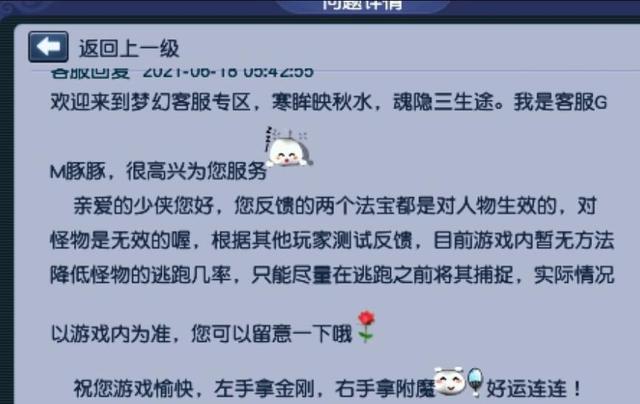 在来这位玩家询问客服人员才知道,原来法宝只是对人物生效,在场景战斗中对怪物使用法宝是不会降低逃跑成功几率的。那么大家知道哪些方式可以降低宝宝的逃跑成功几率吗?这里面追捕技能是无效的,它也是只针对人物生效的技能,不过,小编听说增加满阴德可以降低宝宝的逃跑成功几率,不知道这是不是真的。