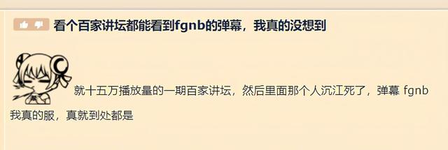甚至于在由央视推出,十分严肃正经的百家讲坛中也会有人在弹幕上刷FGNB