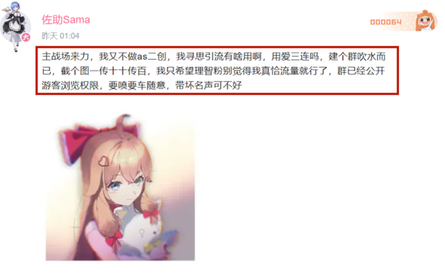 做错事情了就要承认,再说这件事本来就是“佐助Sama”自身的问题。做炉石战旗视频,里面却没有一个是自己的,全凭借粉丝素材;现在更是开始引流,被发现后不仅不道歉反而公然表示,“这里就是主战场”,“AS就是公共厕所”。