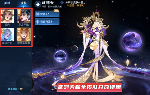 这里的全皮肤试用,还包含了需要用水晶兑换的荣耀典藏皮肤,像是李白的鸣剑·曳影,以及武则天的倪克斯神谕,甚至还有一些限定皮肤。