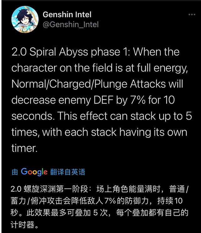 后续的深渊将加入新的机制。在深渊第一阶段中,当场上的角色攒满元素能量时,普通攻击、重击、下落攻击将降低敌人百分之七的防御力,效果持续十秒。而且这个效果可以叠加,最多能够叠加五次。也就是说理想状态下甚至能削弱敌人百分之三十五的防御力,伤害极为可观,这极大地提高了玩家们的通关效率,满星也将变得更容易了。