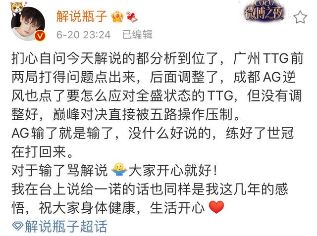 尤其是在最终的巅峰对决之后,AG输了比赛,粉丝直接集体炮轰瓶子,将其归为TTG的舔狗,之后比赛结束,瓶子也是对于这场比赛进行了描述,觉得自己并没有什么问题。
