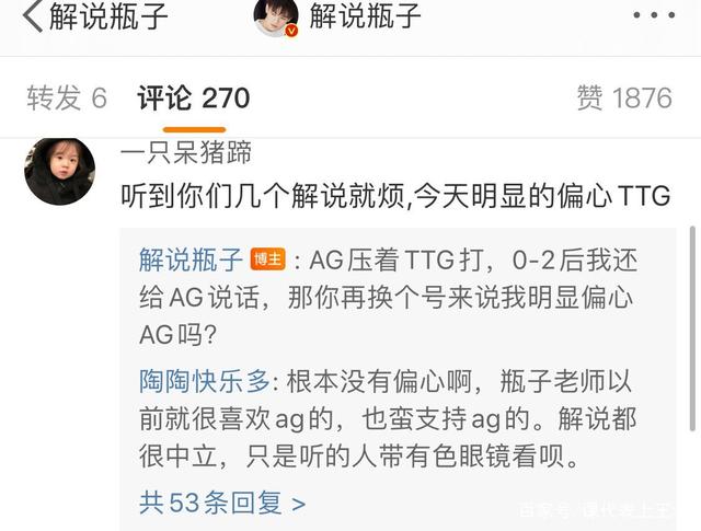 而对于这场比赛,解说瓶子直接被成都AG超玩会的粉丝冲烂了,看到成都AG超玩会2:0领先之后,客观的来说,一般大家都会为落后的一方加油打气或者想对策,而瓶子自然也是不例外,并且作为败者组的决赛,谁都不想看到一场碾压的比赛,都想多看几场,使得比赛更加精彩一点,瓶子自然是在AG领先之后,将话风偏向了广州TTG,这个时候,AG超玩会的粉丝就不乐意了。