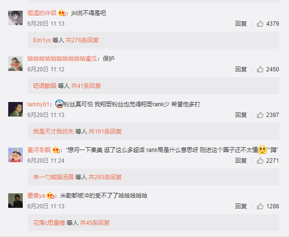 然而就是这样一句发自肺腑的话,却被不理智的粉丝冲得头昏脑胀,一些评论更是充满了浓浓的饭圈味道,甚至有人连Rank是什么意思都没搞懂就开始怒怼,评论中充斥着“保护、加油、giegie已经很努力”的味道。对于粉丝来说,想保护自己的偶像没错,要喷JKL也可以,要喷米勒也可以,但是喷别人的老婆孩子不行!