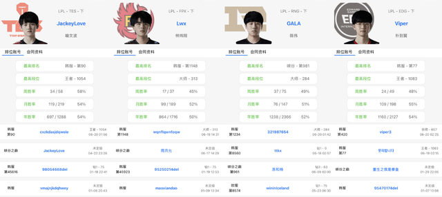 从四位选手的对比数据来看,Jackeylove的总场次确实是最低的,而且比春季赛冠军RNG战队的Gala少了将近1000场,Lwx的总场次也并不多。