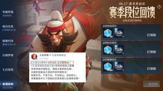王者荣耀s24赛季更新时间已经正式官宣,确定将于23号正式更新,23号新赛季的全部内容上线正式服,新赛季一般都是周二或者周四进行版本大更新,而此次23号属于周三是相对原本24号更新提前了一天,玩家上分的时间也是相对减少了一天。