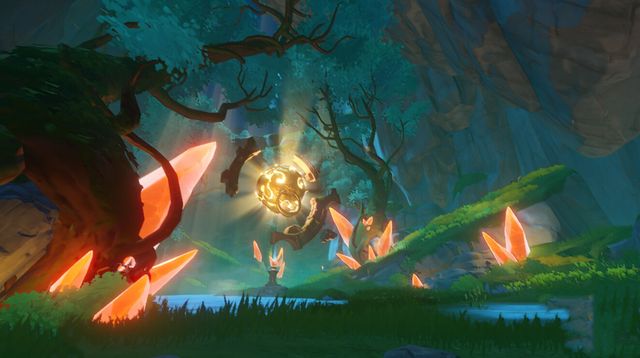开局的冲刺!在实机演示中,丘丘雷兜王的技能,也发生了很大的变化,一般像同类型的怪物,开局都是拿大范围的地震或者锤击起手,但它却截然不同,会在原地短暂的蓄力,然后用头上的犄角,对玩家们进行快速的冲撞攻击(就真的按牛的攻击方式设计呗!),速度相当的迅速,如果玩家们反应不及的话,很容易被直接撞飞,受到高额的伤害(钟老爷子在手,丝毫不用慌张),不过丘丘雷兜王用完这招后,会因为冲的太猛,摔倒在地上,玩家们可趁这个时机发动反攻。