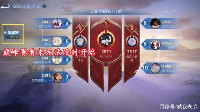 没办法,根据目前时间来看,新赛季的开启已经过去五小时左右了,但是在王者段位拥有玩家上面,目前却才三千左右,而巅峰赛的开启,根据要求来看,则是需要1w名最强王者段位的玩家才行,所以按照18点开启巅峰赛这点来看,s24赛季的巅峰赛,并不能准时开启了,毕竟现阶段已经来到了15点,距离18点也就三个小时的剩余时间,显然,这三个小时里面,最强王者段位的玩家应该并不能多出来这剩余的七千名,所以,s24赛季的巅峰赛在开启时间上面,可能相比较以前要延期了,但是新赛季首日肯定是会开启巅峰赛的,这点还是不会有啥太大问题的。