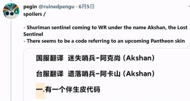 在卢锡安和赛娜输入失败后,我们只能想到的就是新英雄光明哨兵。而光明哨兵的名字在上个月英雄联盟手游国服解包中已经透露了,国服的翻译是“迷失哨兵 阿克尚”,他的英文名字是Akshan。因此,我们输入“Akshan”后成功进入新的页面。