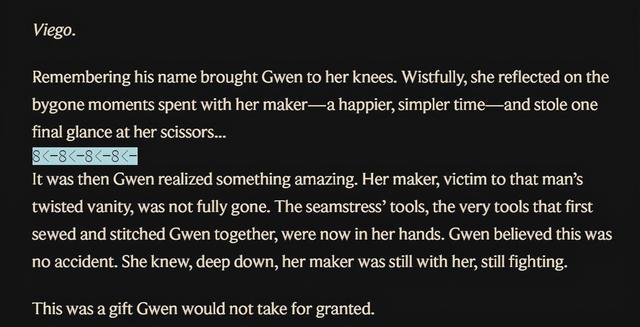 系统会要求玩家输入密码,既然这个八音盒指向的不是佛耶戈就是格温,因此我们可以去这两个英雄的人物传记里看看。在英雄联盟宇宙美服的格温人物传记中,我们将页面反白后可以看到,官方增加了新的数字“8<-8<-8<-8<-”。