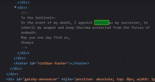 但如果没有出现爆料事件,我们该如何知道阿克尚的名字呢,其实在这个解谜网页的源代码里就有提示了。源代码中镶嵌了一段留言作为最明显的提醒,“致哨兵们:在我身亡之后,我将任命阿克尚作为继任者,他继承我的武器,并且从亡者的力量中守护恕瑞玛。愿你们有一天能找到我们。Shadya。”