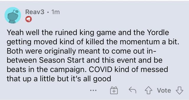 英雄团队的负责人Reav3,在是论坛上透露了消息,按照原定的计划,RPG游戏《破败之王》和约德尔人新英雄,应该是在赛季初至这次光明哨兵活动的期间推出的,来让破败事件的气氛变得更高。但新冠疫情影响了进度,《破败之王》单机游戏跳票到现在还没有,约德尔人英雄进行了玩法调整,所以推迟了发布时间。