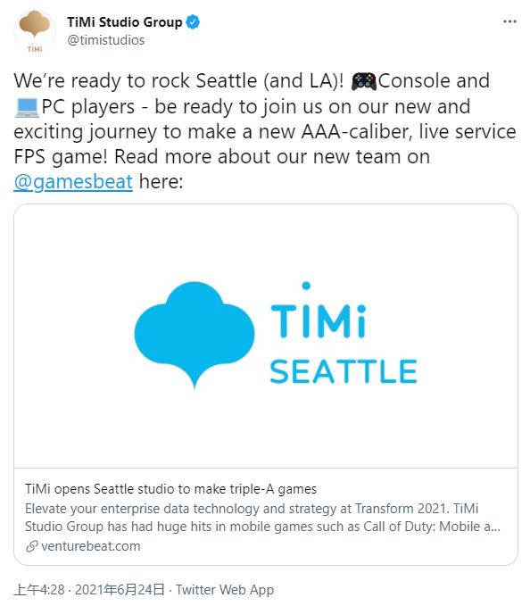 IT之家 6 月 23 日消息 腾讯天美在今日发推表示,天美在美国西雅图成立了新游戏工作室,该工作室将致力于开发 PC 和主机端的射击类 3A 大作。