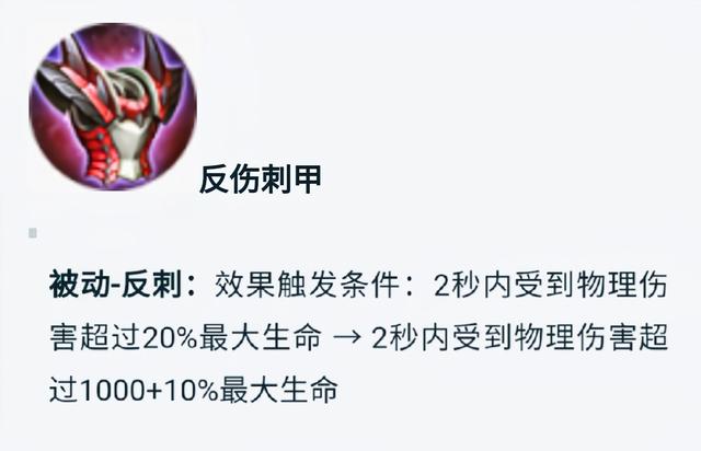 只要单次伤害超过当前生命的百分之十,就可以触发,而反伤刺甲的触发,如果生命值太低,是无法触发反刺效果的,而且就算是触发了反刺,如果距离太远也无法对对方造成伤害。