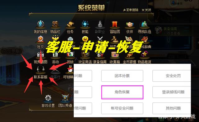 3、如何找到客服?进入游戏点击“Esc”,左下方有个“联系客服”按钮,进入后会有专门的“恢复角色”选项,填写基本内容后,大概会在1-3个工作日内完成恢复。(其他有关被盗、失误操作、补票、兑换错误的问题,也都可以找客服)