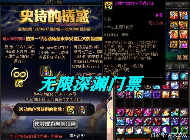 周年庆版本中上架了一个活动,“史诗的诱惑”!最大的特色在于,送了玩家一张“无限门票”,持有该道具,就可以不消耗引导石进入智慧的引导,也就是说,只要你的疲劳足够多,那么无限门票就可以一直使用,不过这还没完!