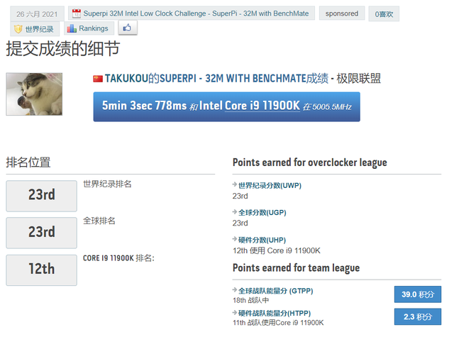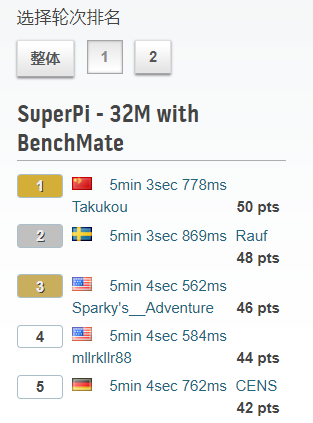IT之家 6 月 29 日消息 HWBOT 网站近日举办了 SuperPi - 32M 跑分大赛。这一比赛限制使用英特尔酷睿桌面处理器,主频不得超过 5006 MHz,选手需要在这一条件下尽可能获得 SuperPi - 32M 圆周率运算的最高成绩,时间越短越好。国内玩家 Takukou 参与了这场比赛,提交的成绩获得了认证,第一轮暂列世界第一名。